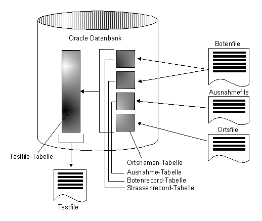 Die Sourcefiles (Botenfile, Ausnahmefile, Ortsfile) werden mittels Oracle SQL*Loader in die Oracle Datenbank eingelesen (Ortsnamen-, Ausnahme-, Botenrecord-, Strassenrecord-Tabelle). Eine PL/SQL Stored Procedure erzeugt anschliessend das Testfile. Lösung Der von Akadia entwickelte Testdaten Generator trägt wesentlich dazu bei die Zustellzeit und Qualität für Postsendungen weiter zu optimieren. Das auf den Verteilanlagen eingelesene Wörterbuch spielt dabei die zentrale Rolle.
