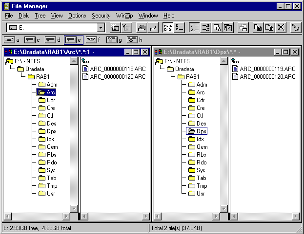 Die archivierten offline Redolog-Files sind im Directory E:\Oradata\RAB1\Arc und E:\Oradata\RAB1\Dpx vorhanden, sie sind also doppelt vorhanden. Um mehrere Archive-Prozesse zu starten kann der INIT.ORA Parameter ARCH_IO_SLAVES = n (0 - n) gesetzt werden. |
